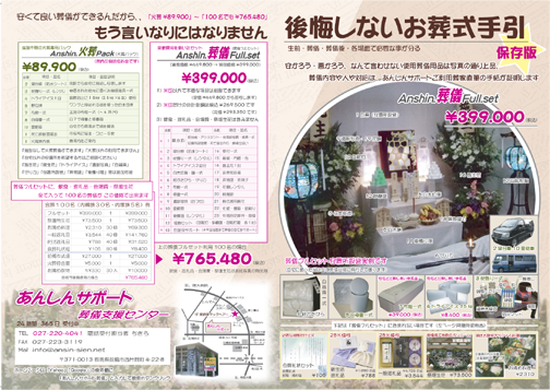A3両面カラー1枚のパンフレットと 葬儀の手引と表紙に書かれた