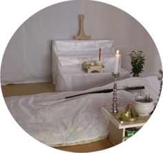 安置した部屋に白幕を張り、祭壇を整え、化粧や整髪を済ませ
