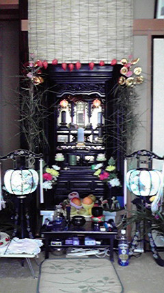 あちこちを走り回って探して作ったのが 写真の仏壇を使った盆棚で