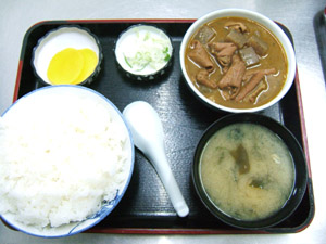ご飯、沢庵2切れ、みそ汁、もつ煮で590円だったと思う。 ただし、
