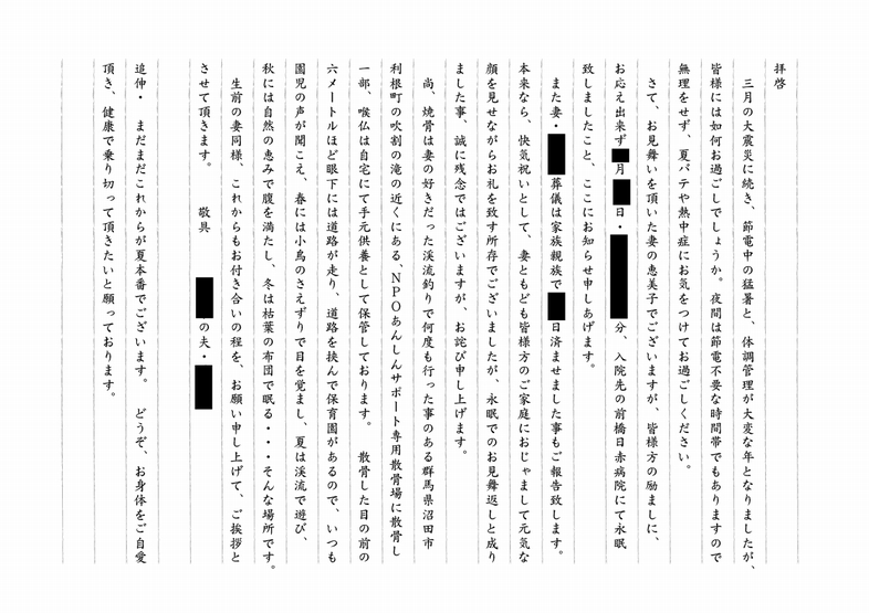 し上げて、ご挨拶とさせて頂きます。 敬具 ○○の夫・△△男