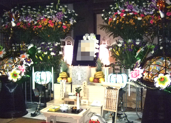 写真左下 葬儀後、自宅に2対の生花と後飾り祭壇を飾りました